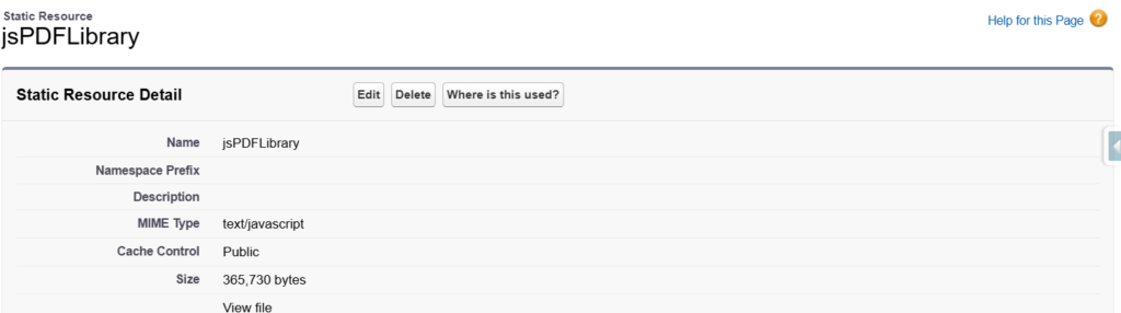- Upload as a Static Resource: In Salesforce, Go to Setup then Static Resources and upload the jsPdf file. Name the resource –