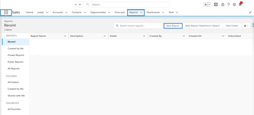 Tabular Report: Navigate to the Reports tab to begin. Click the App Launcher (9 dots) if you cannot view it. Click “New Report” after that.