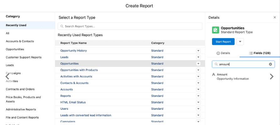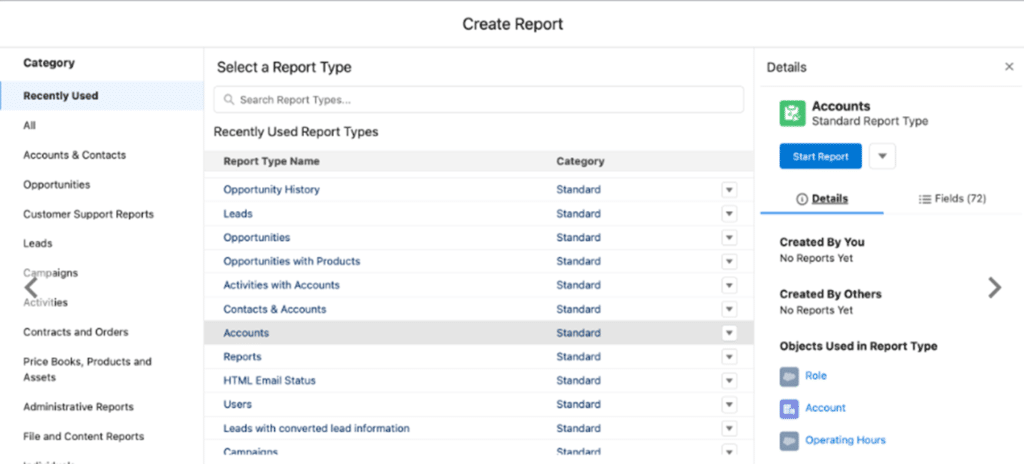 The next step is to choose the report type containing the standard and custom object(s) you want to report on. When you click on the name of any report type, a side panel will show you additional information (like the objects included in the report type) and which fields you can filter or display in the report. Both standard report kinds (such as Accounts or Opportunities) and custom report types have access to this information.