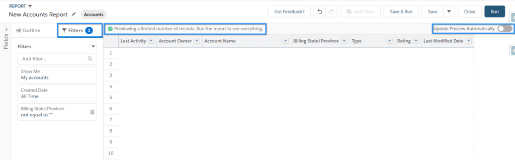 Joined Reports: You can generate two distinct reports for data comparison using bound reports. To display the entire number of opportunities and cases for each account side by side, you can utilize a Joined report.