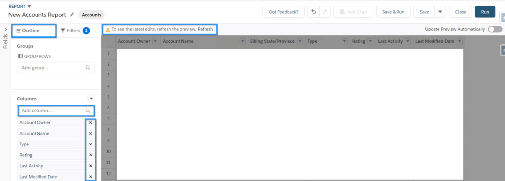 Proceed to the “Outline” page to select the fields shown in your report. There are fields in native reports that are offered by default. You can add your fields by searching for the field name and choosing it, or you can delete them by clicking the “X” next. You can rearrange fields by dragging and dropping them in a different sequence.