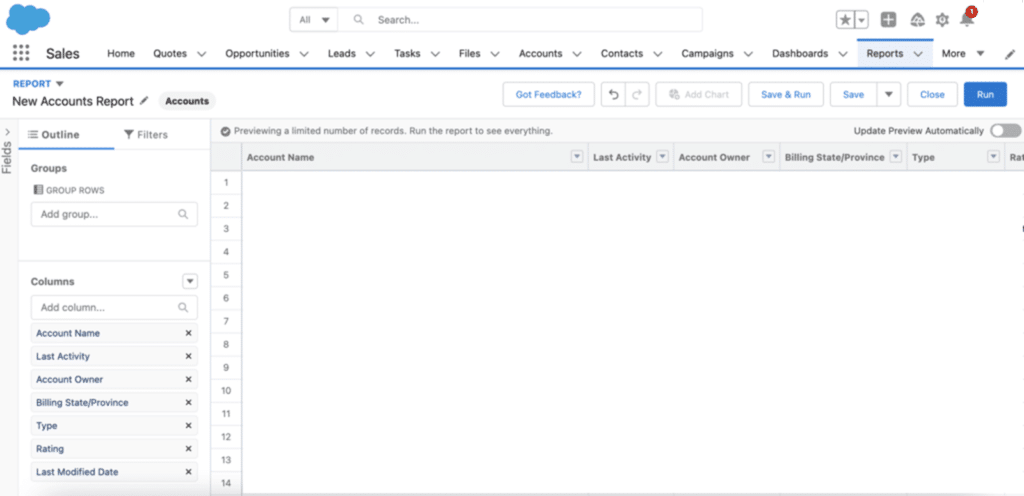 One drawback is that it does not offer visualization. Therefore, you will need to create any necessary graphs or charts independently. Additionally, reports have a ten-minute time limit; if your data takes longer than that to make, Salesforce will cancel the report.