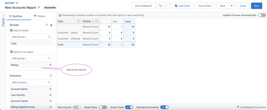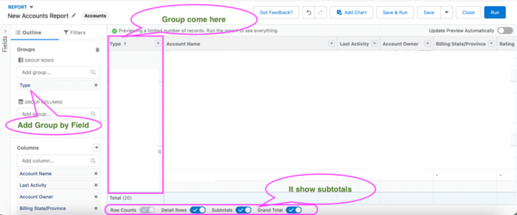 Summary Report:Â Upon adding a grouping, the report will become a summary report. The most popular type of reports are undoubtedly summary ones. They work well for grouping data; for example, you may group your report by Account Name to examine the quantity or value of opportunities per account. Fields can also be sub grouped by dragging them beneath the parent group.