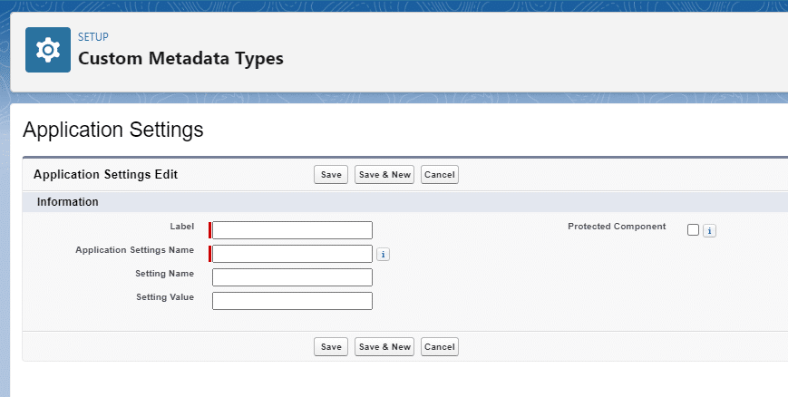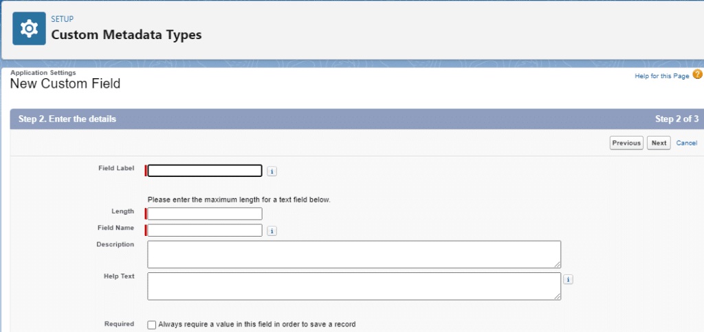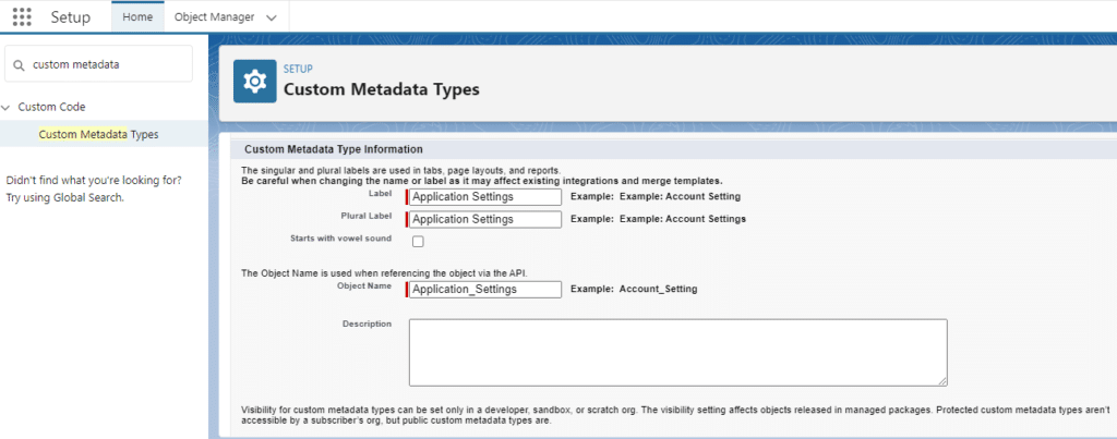 Selecting “New Custom Metadata Type” under Setup > Custom Metadata Types. As with a standard custom object, you must provide a label, name, and description for your Custom Metadata Type.