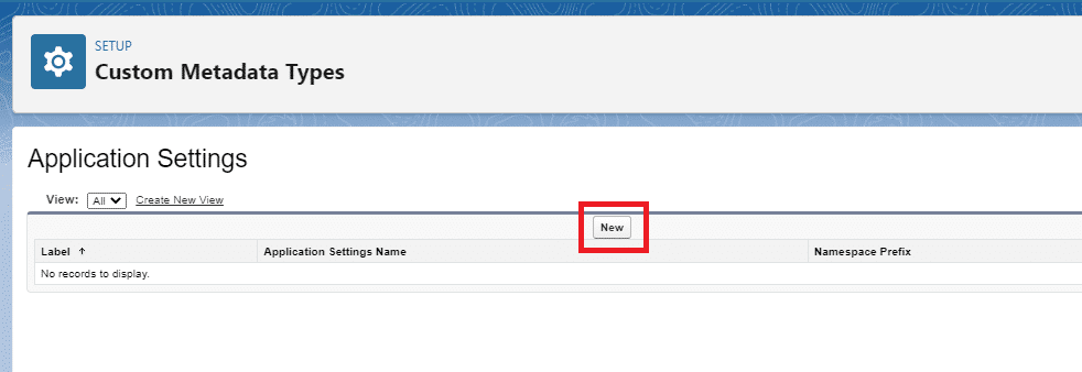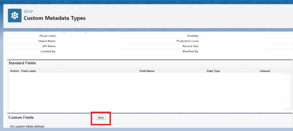 Step 1:Â Look for “Custom Metadata Types” under Setup first. As indicated below, click “New Custom Metadata Type.”