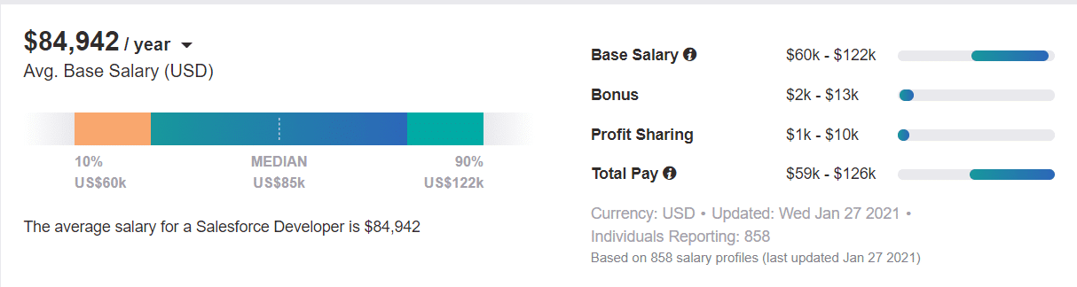 For instance, you are going for the mentioned job in some area of the United States, as a beginner, you can earn around $70,000 per annum. But as you move further in the business and attain some experience, your paycheck can get you up to $120,000 per annum. Thus, we can predict an average salary of $85,000 to work as a Salesforce Developer for 12 months.