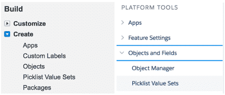 Let’s say you want a picklist value set to store T-shirt Sizes and then use this picklist value set on custom fields on Accounts and Contacts in your Salesforce instance. You can find picklist Value Sets under Create Section in Classic UI or under Objects and Fields in Lightning UI.