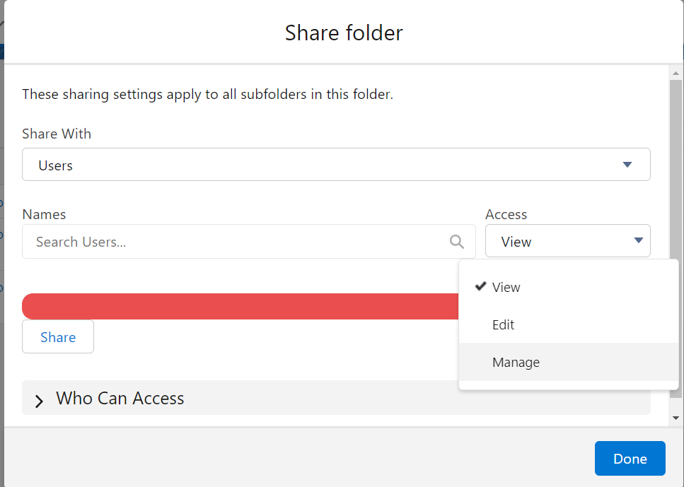 Once you have set the desired access levels and selected the relevant users, roles, or public groups, click “Done” to confirm the sharing settings. You have now successfully shared your reports in Salesforce Lightning.