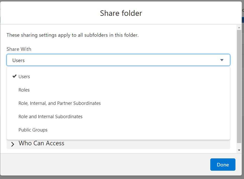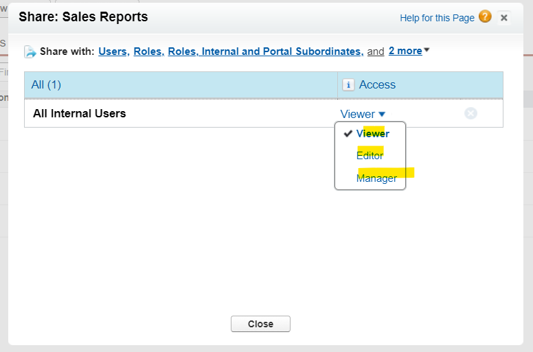 - Click on the “Share”. This will open the sharing settings for the folder. You will see options to share the Report folder with users, Roles, Roles and Subordinates, and Public Groups.Â