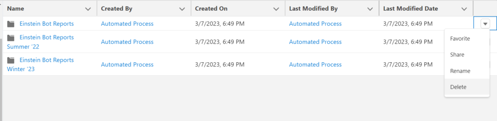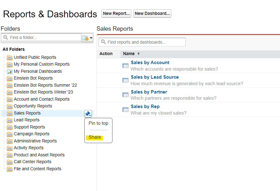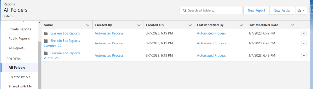 Contrary to what you might expect, sharing individual reports is not done directly. Instead, you need to share a folder that contains the desired report(s). Click on the “All Folders” option on the left-hand side to view the available folders. In this example, we have a folder named ” Einstein Bot Reports.”