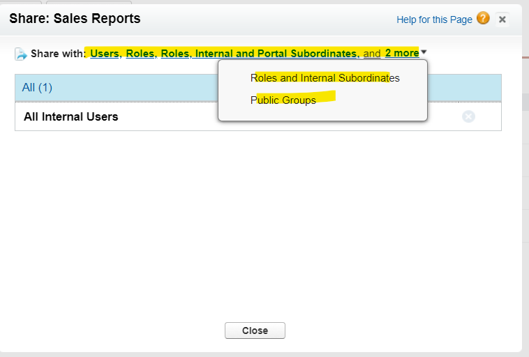 If you have created specific public groups, you can select the “Public Groups” option and choose the appropriate group from the dropdown menu. This allows all members of the selected public group to access the shared report.