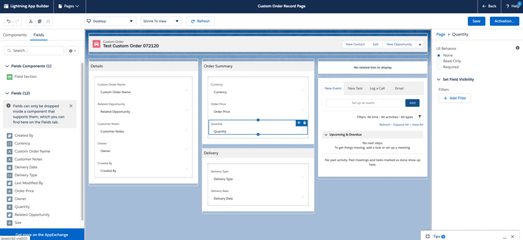 1. Create a Page: The most obvious thing you need for a Salesforce Dynamic Form is a page layout. This also works on any migrated page that needs to be upgraded to Dynamic Form. Once you are good to go with the required page, click on the ‘Field Section’ component on the left side of your screen. This way you can easily add fields directly to the Lightning page which you’ve recently created.