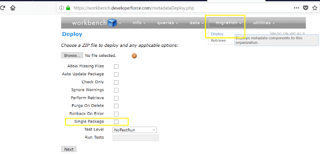 • In the Object Folder, add the file My_First_Big_Object__b.object.The package.xml file should be in the root of the folder. Add the My_First_Big_Object.permissionset file to the permissionset folder. Use ANT Tool or Workbench to assist in the deployment.Get into Workbench.To select the Single Package option, click the Migration tool in the workbench and select the image below.