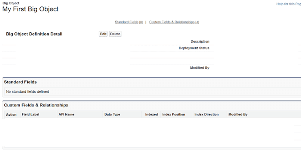 • Custom big objects: Custom oversized items are brand-new objects you make to hold data specific to your company. The Lightning Platform’s capabilities can be expanded with custom large objects. To track past inventory levels for analysis and potential future optimizations, for instance, create a new large object named HistoricalInventoryLevels if you’re developing an app to track product inventories. The configuration and deployment of custom large objects are covered in this implementation guide.