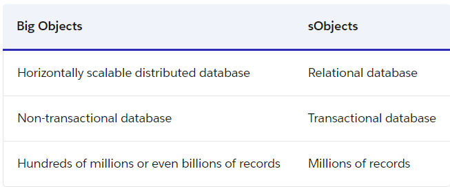 A big object differs from ordinary objects, such as sObjects, in that it can hold data on an infinite scale. Large items are kept in a separate area of the Lightning Platform as well.