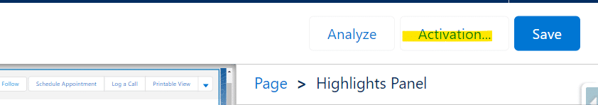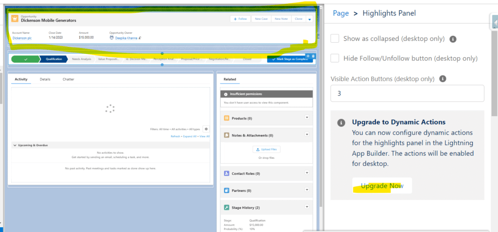 • In the Highlights Panel properties pane, look for the “Upgrade Now” button. Click on it to enable Dynamic Actions for that specific record page.