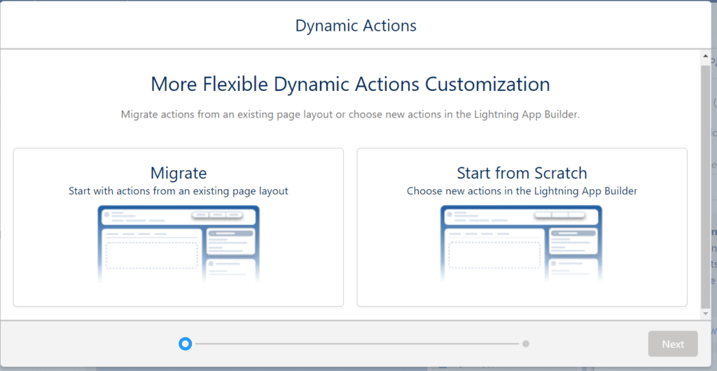 a. Migrate: If you already have actions configured on the record page, you can step through the migration assistant. This will help migrate your existing actions to Dynamic Actions.
