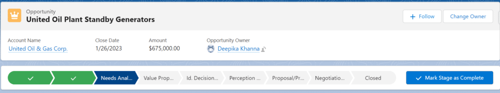 • For the “Needs Analysis” stage, you may want to show the actions: “Change Owner”