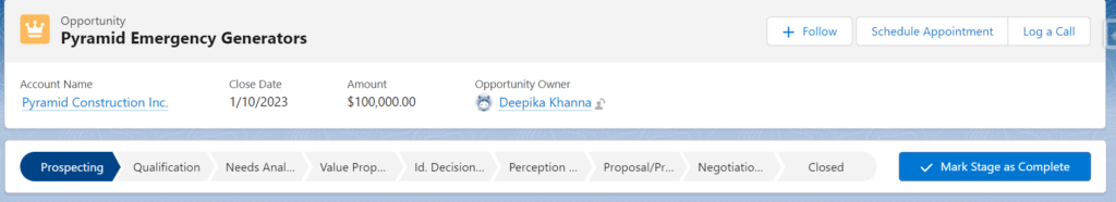 For Prospecting Stage you will see actions like “Schedule Appointment” and “Log a Call”