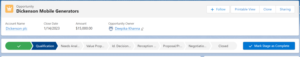 • For the “Qualification” stage, you may want to display the actions: “Printable View”, “Sharing”  and “Clone” to move the opportunity forward.
