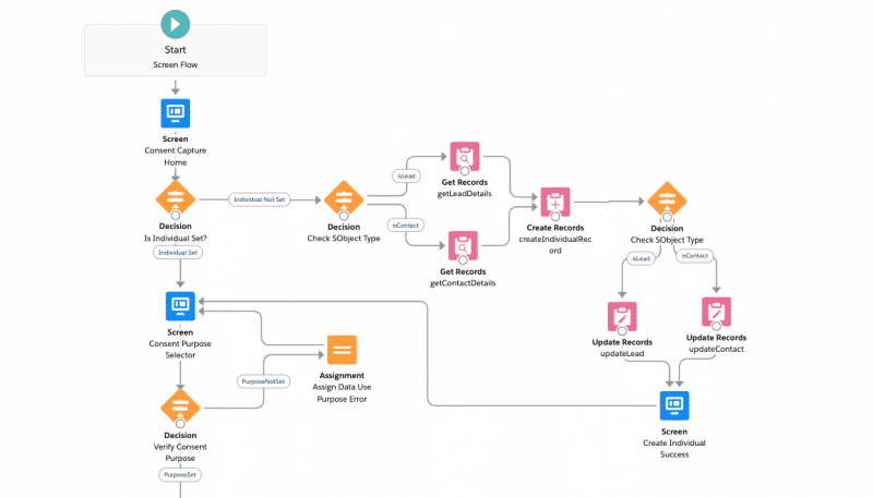 A flow of Salesforce is also known as Lightning flow. The Flows in Salesforce is an application used to automate complicated business processes. Salesforce allows users to gather specific datasets and performs automated functions by utilizing them altogether. Salesforce can help build individual flows as per their needs and preferences with the help of Salesforce Flow builder. Salesforce Flow builder helps you to build logic codes without the requirements of any particular programming language. This makes the process of building flows more accessible and faster.