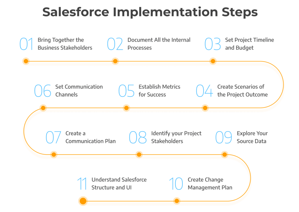 Salesforce implementation requires a planned approach that takes into account the specific demands and goals of your firm. Here is a step-by-step manual to assist you in successfully implementing Salesforce: