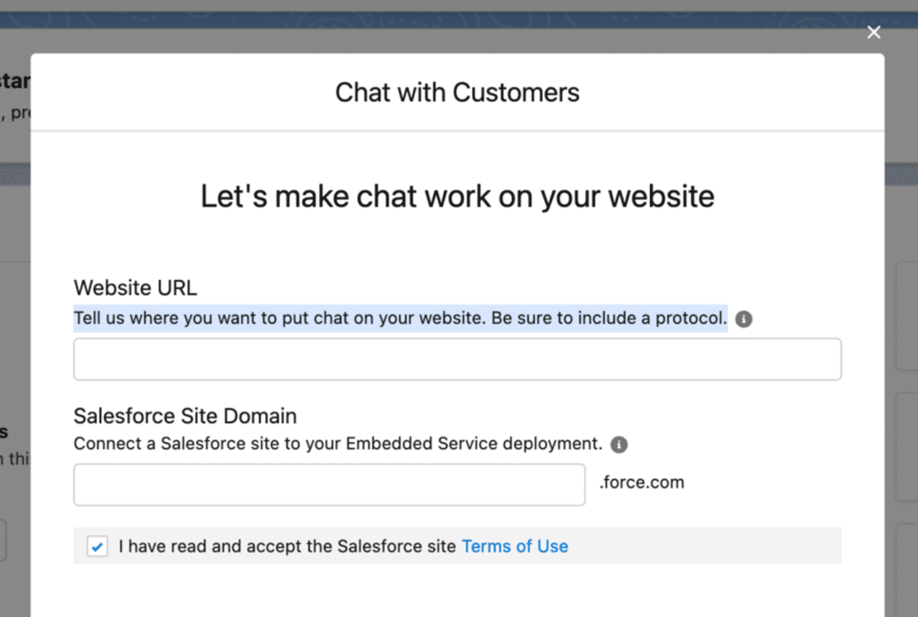Inform Salesforce of the location of the chat window on your website. Remember to add a protocol.