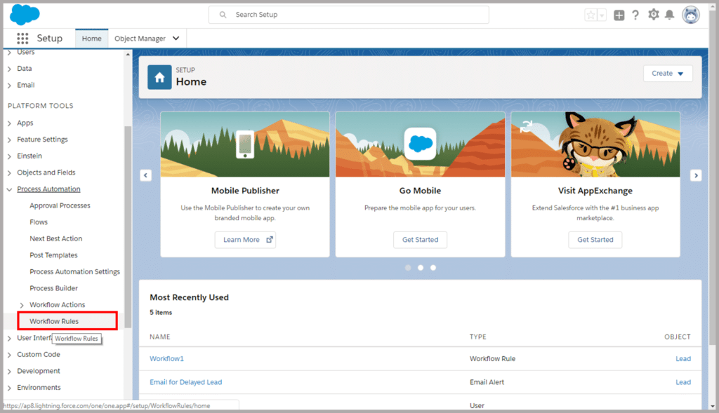 Step 1: The left side of the screen will display a menu. To discover Process Automation, scroll below. Locate and click on Workflow Rules under this section.
