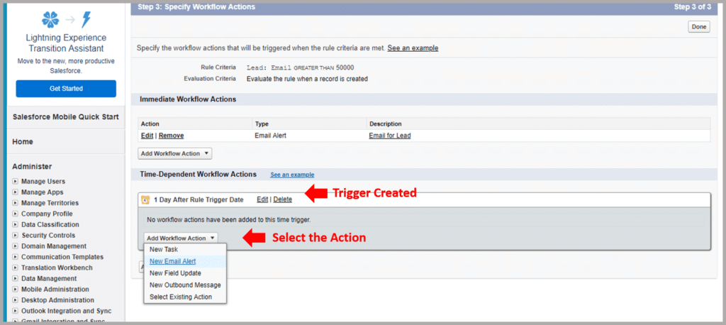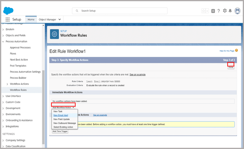 Step 5: A Workflow Action must be added in this step. Click on Done after choosing the desired action (in this case, New Email Alert) from the drop-down menu.