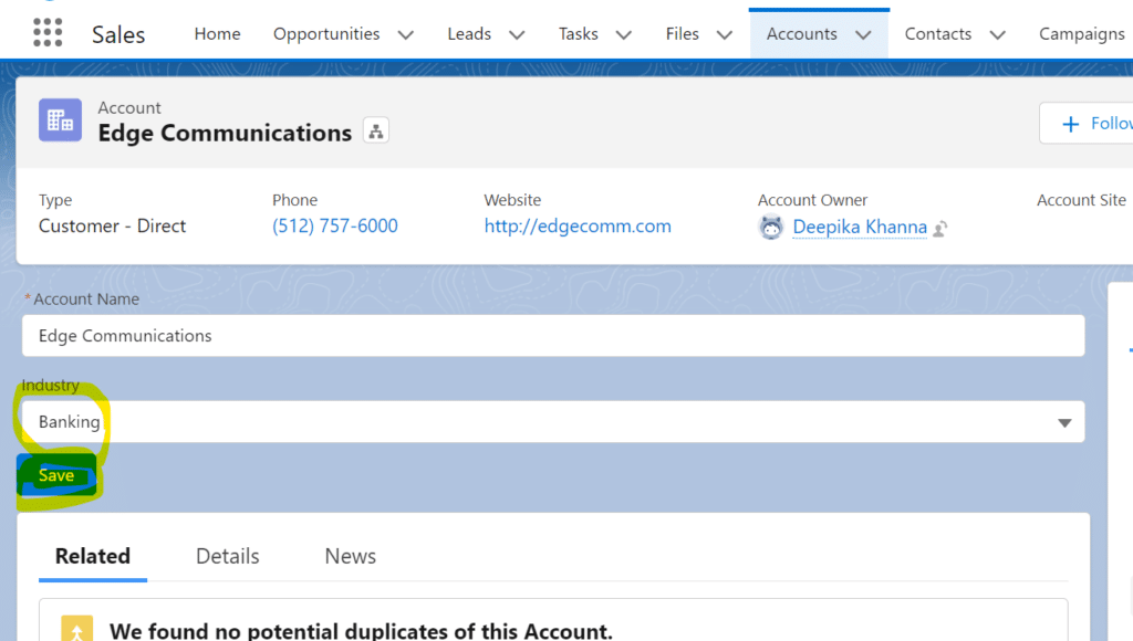 I have dropped this component to the Account Record page and through this component, I can successfully update Account’s Industry and Name by clicking the save button as shown below.