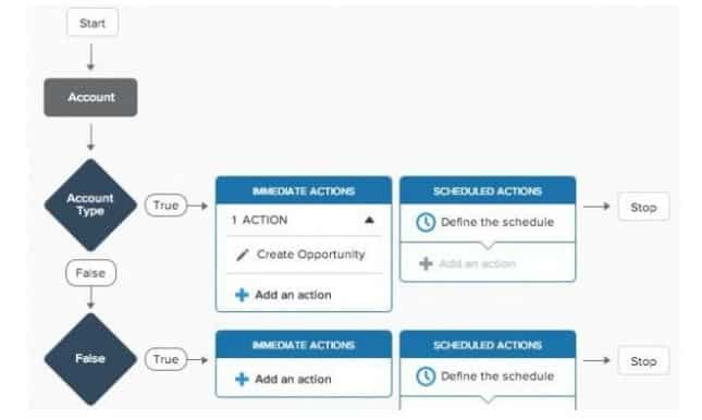 2) Process builder also has a powerful and easy to use UI (User interface): You can add multiple workflows based on different criteria. Process builder are way more powerful then workflows.You can build complex processes using Process Builder.As you can see in the diagram, we have different workflow based on different criteria. In the above flow diagram, I am working with an account object, and the criteria that i have is ( if the account type is Prospect) if that’s true, then I have added an immediate action of creating an opportunity.