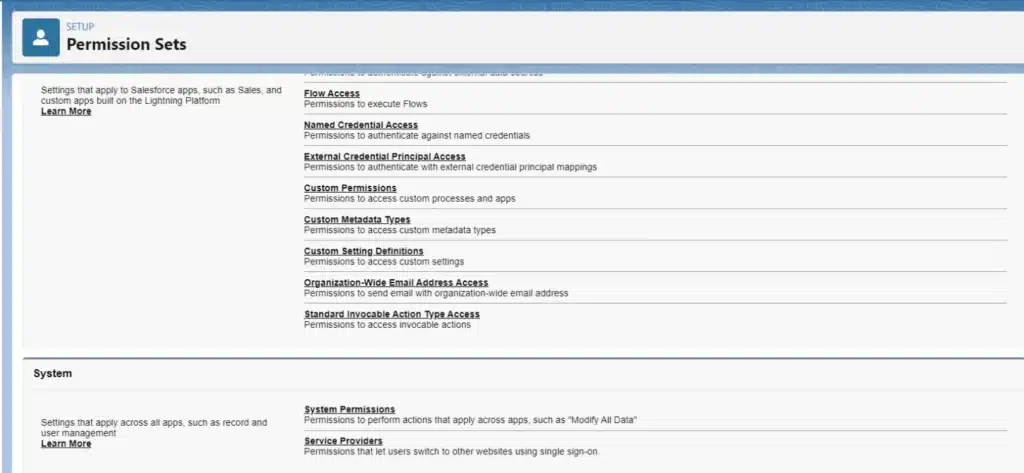 • Search for “Permissions” in the search box. Create a new Permission Set.