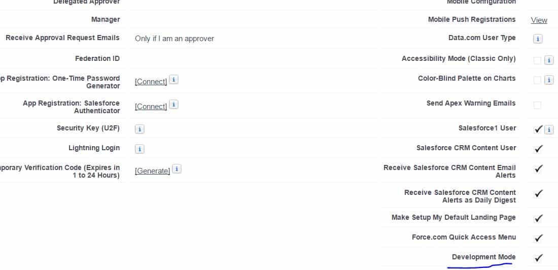 Step 1: Enable the developer mode to create visualforce pages.