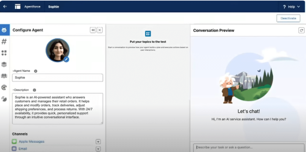 Agentforce’s setup is straightforward, utilizing natural language inputs to configure agents. For example, you can assign an agent’s name, description, and communication channels with a conversational approach. Salesforce’s guiding principle here is simple: “If you can dream it, Agentforce can do it.”