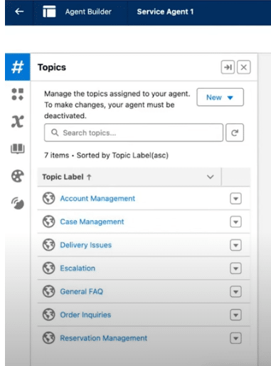 At the core of Agentforce lies the Agent Builder, housed within Agentforce Studio. This user-friendly interface simplifies the process of creating and managing AI agents. The Studio is organized into four key sections:
