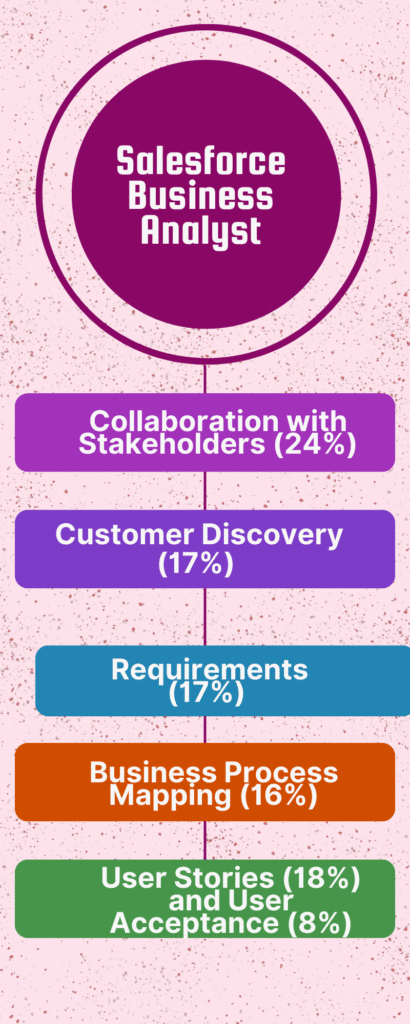 In Salesforce exams, there are different topics, and each one is worth a certain amount of points. When you take the Business Analyst certification, you’ll be tested on your understanding of six main categories.