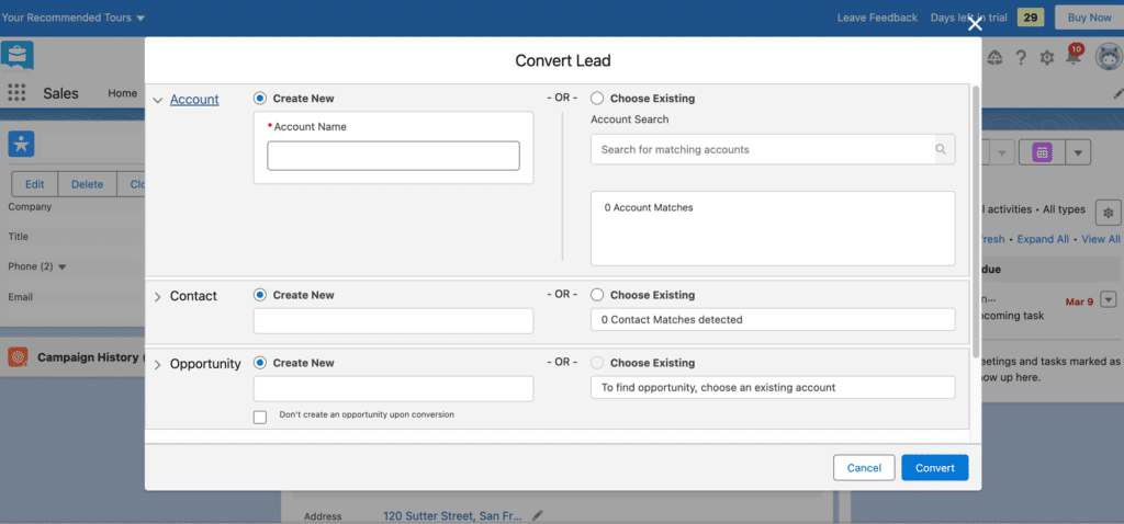 - If the names given to contacts and accounts in the lead are the same, you can update the current records.